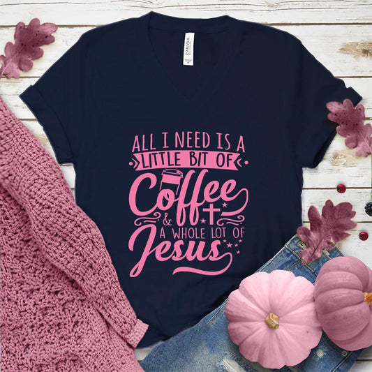 All I Need Is A Little Bit Of Coffee Plus A Whole Lot Of Jesus V-Neck Pink Edition