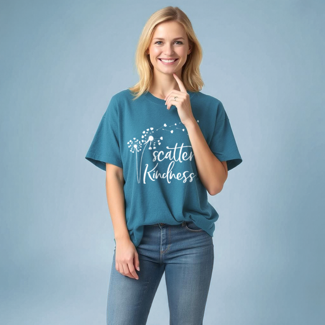 Elevate your everyday wardrobe with the Scatter Kindness T-Shirt, a garment that combines fashion with a heartfelt mantra. This eye-catching tee features a whimsical dandelion design with the inspiring phrase "Scatter Kindness," reminding wearers and onlookers alike to spread love and positivity wherever they go.