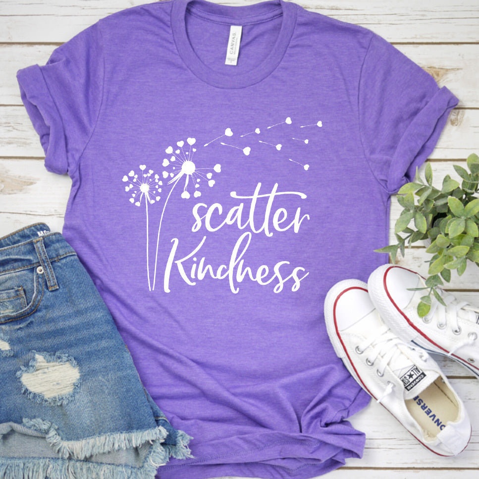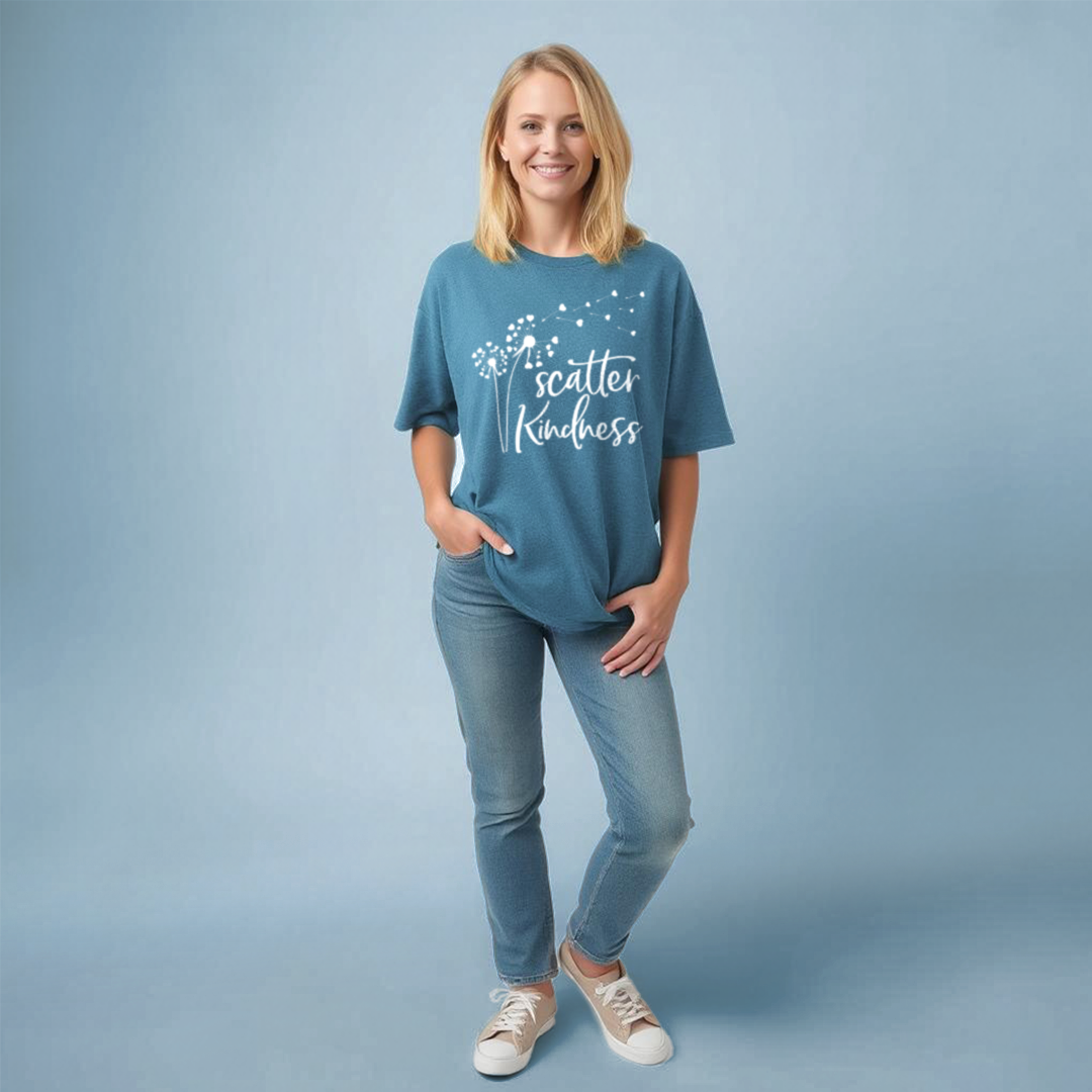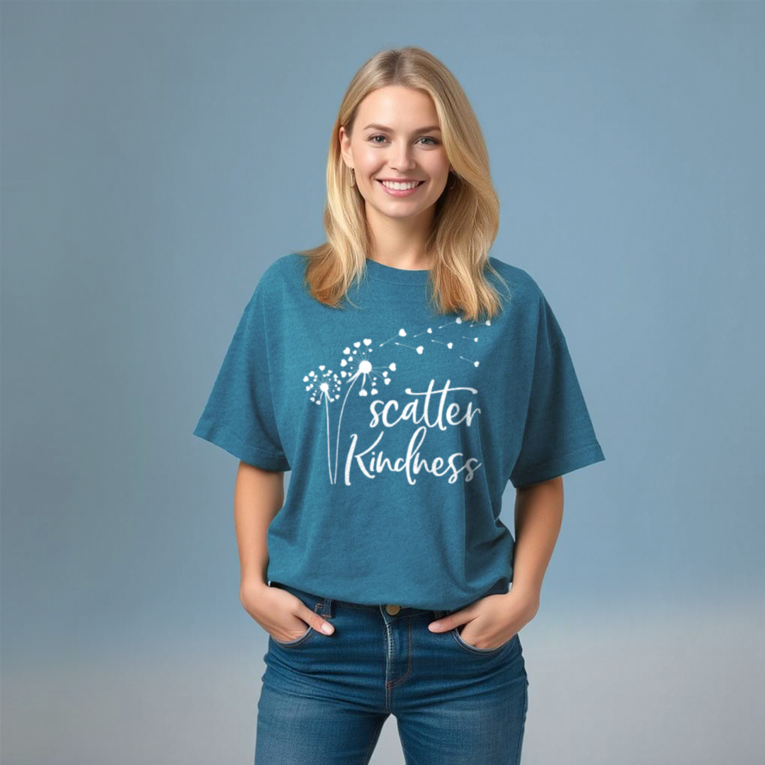 Available in an array of colors to suit every season of life, this t-shirt pairs seamlessly with jeans, shorts, or skirts, making it a flexible addition to any outfit rotation. Ideal for layering under a cozy cardigan in autumn or wearing solo in the summer breeze, the Scatter Kindness T-Shirt is more than just apparel—it's a conversation starter and a beacon of goodwill.